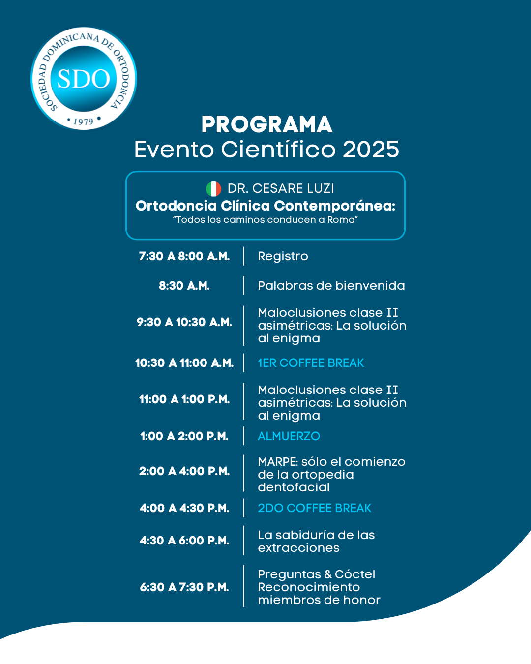 El encuentro científicode este año contará con la participación de la magistral ponencia del Dr. Cesare Luzi, reconocido ortodoncista italiano, quien presentará el tema: “Ortodoncia Clínica Contemporánea: Todos los caminos conducen a Roma”.